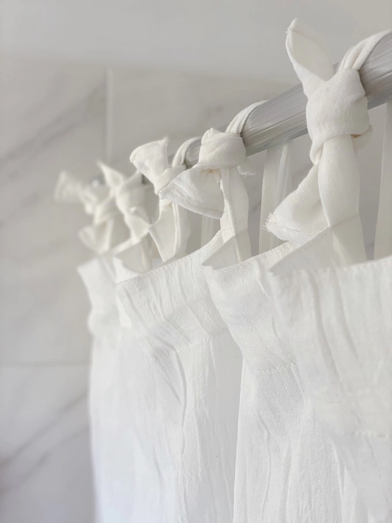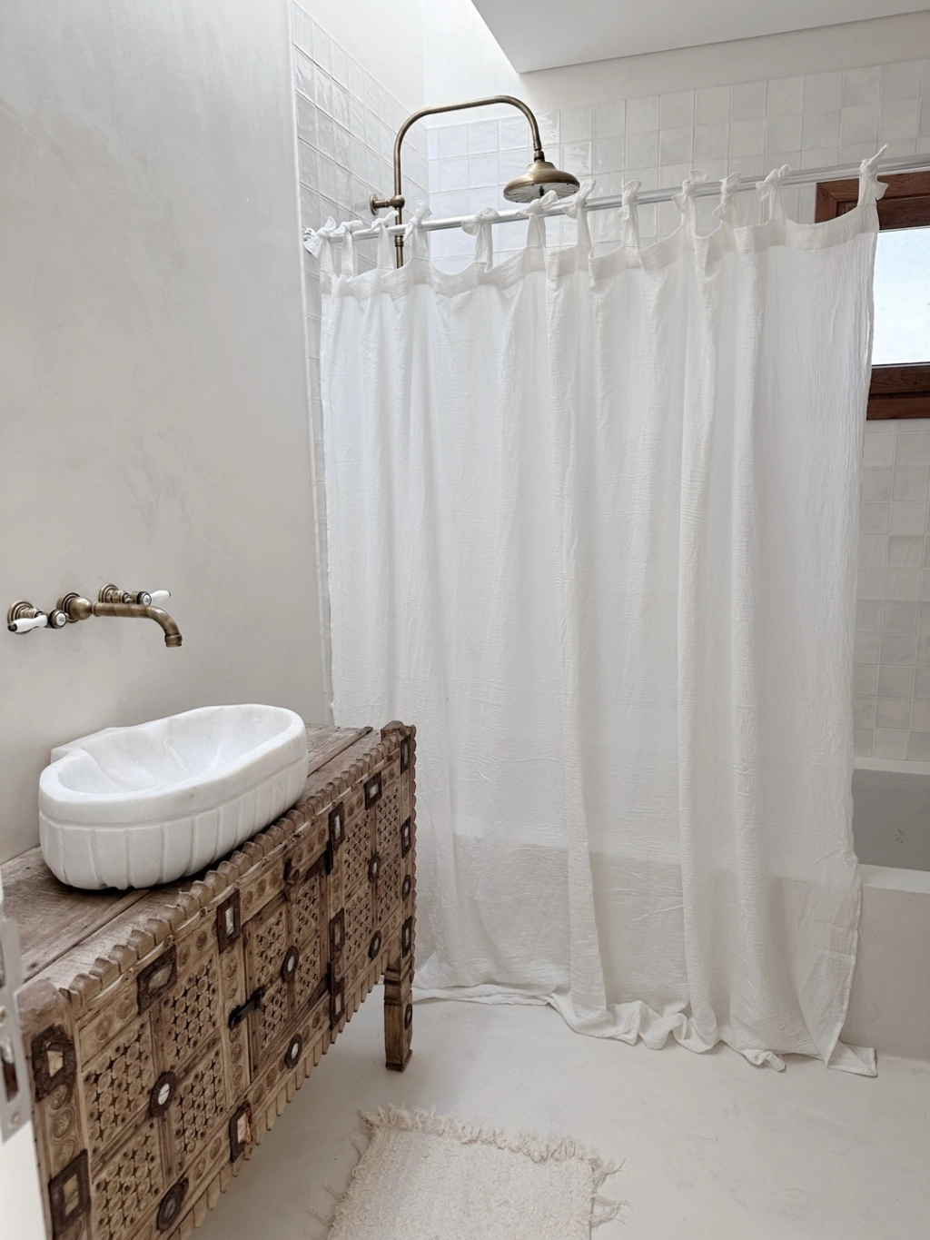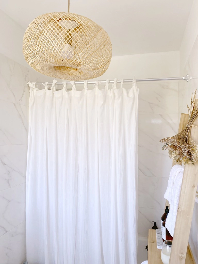 Nuestra cortina está confeccionada en gasa de algodón, un textil liviano y natural que aporta calidez y estilo a tu baño.