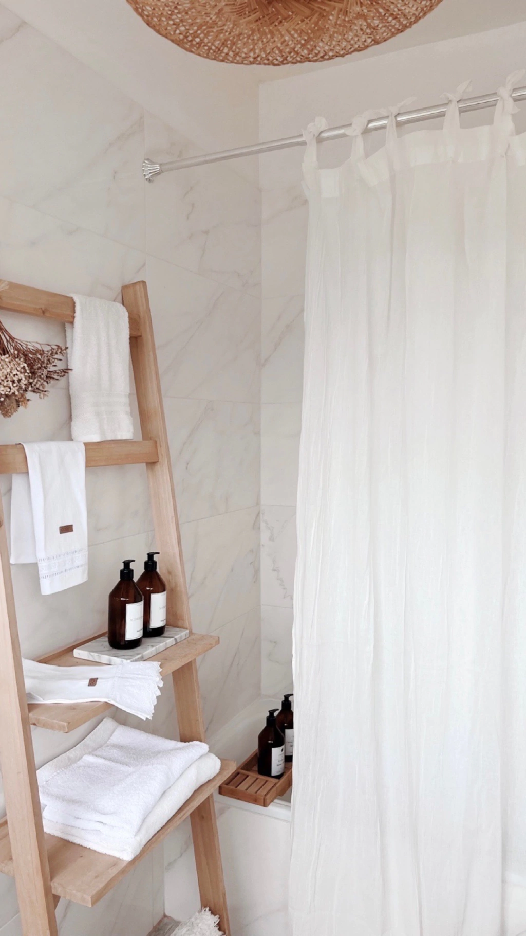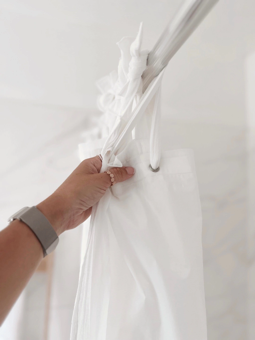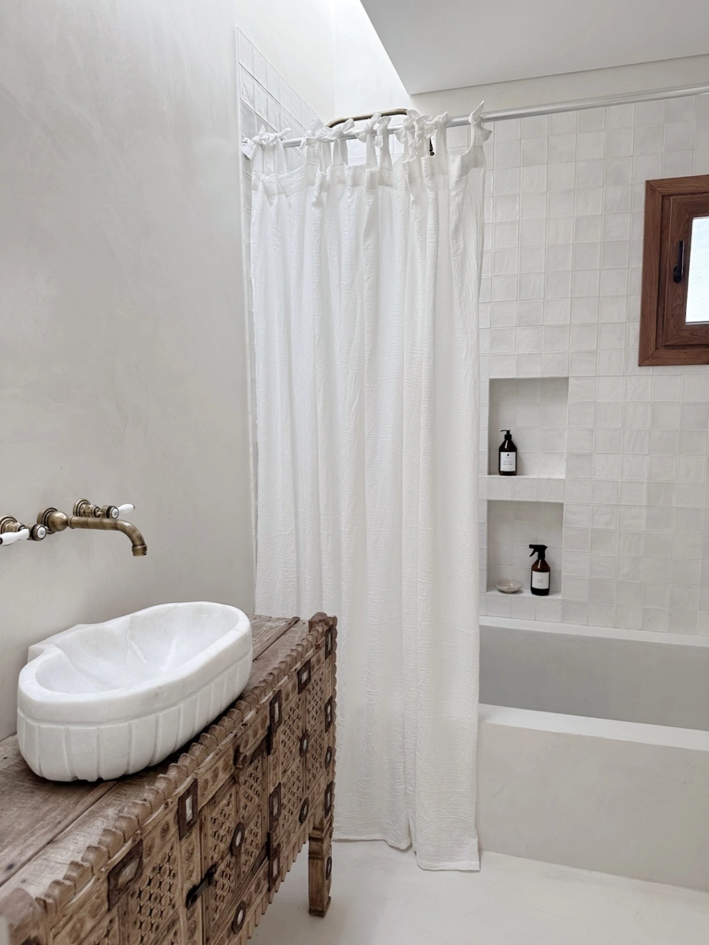 Nuestra cortina está confeccionada en gasa de algodón, un textil liviano y natural que aporta calidez y estilo a tu baño.