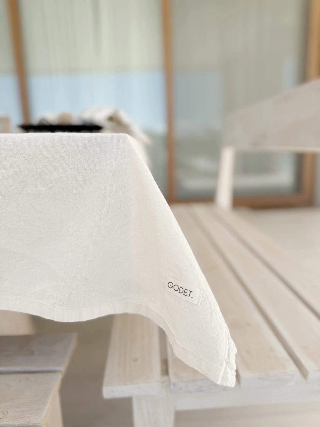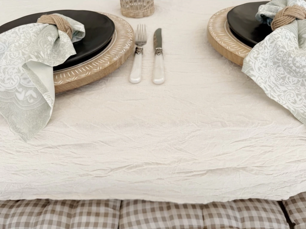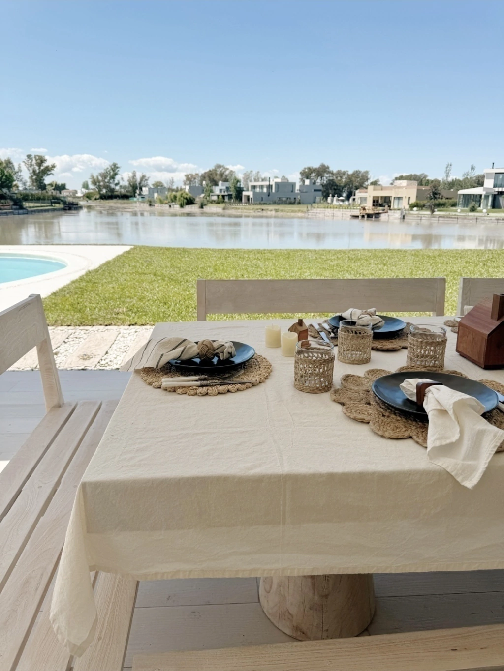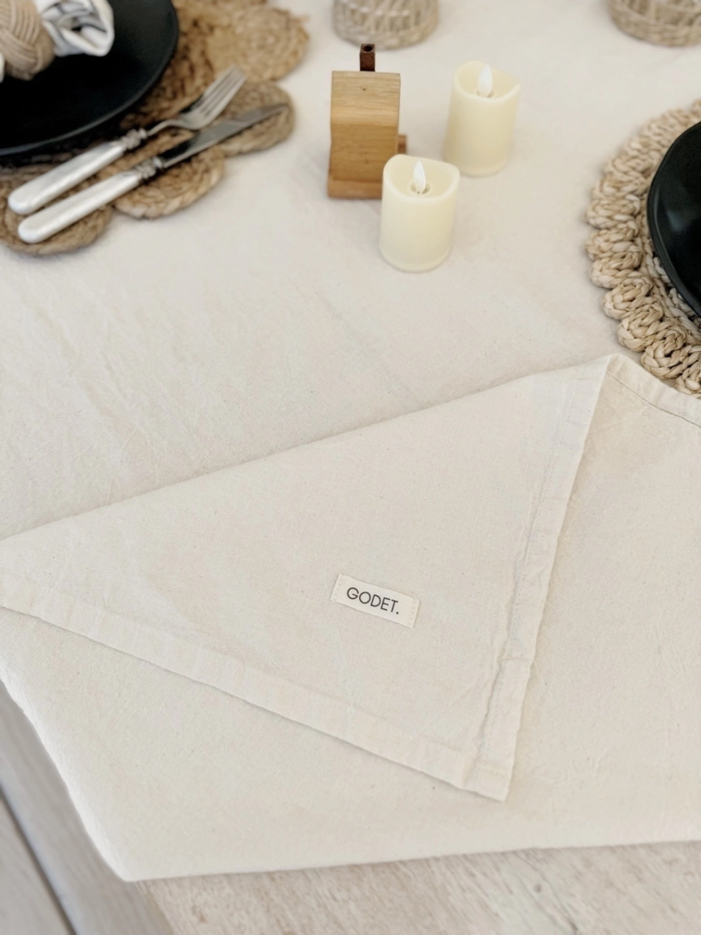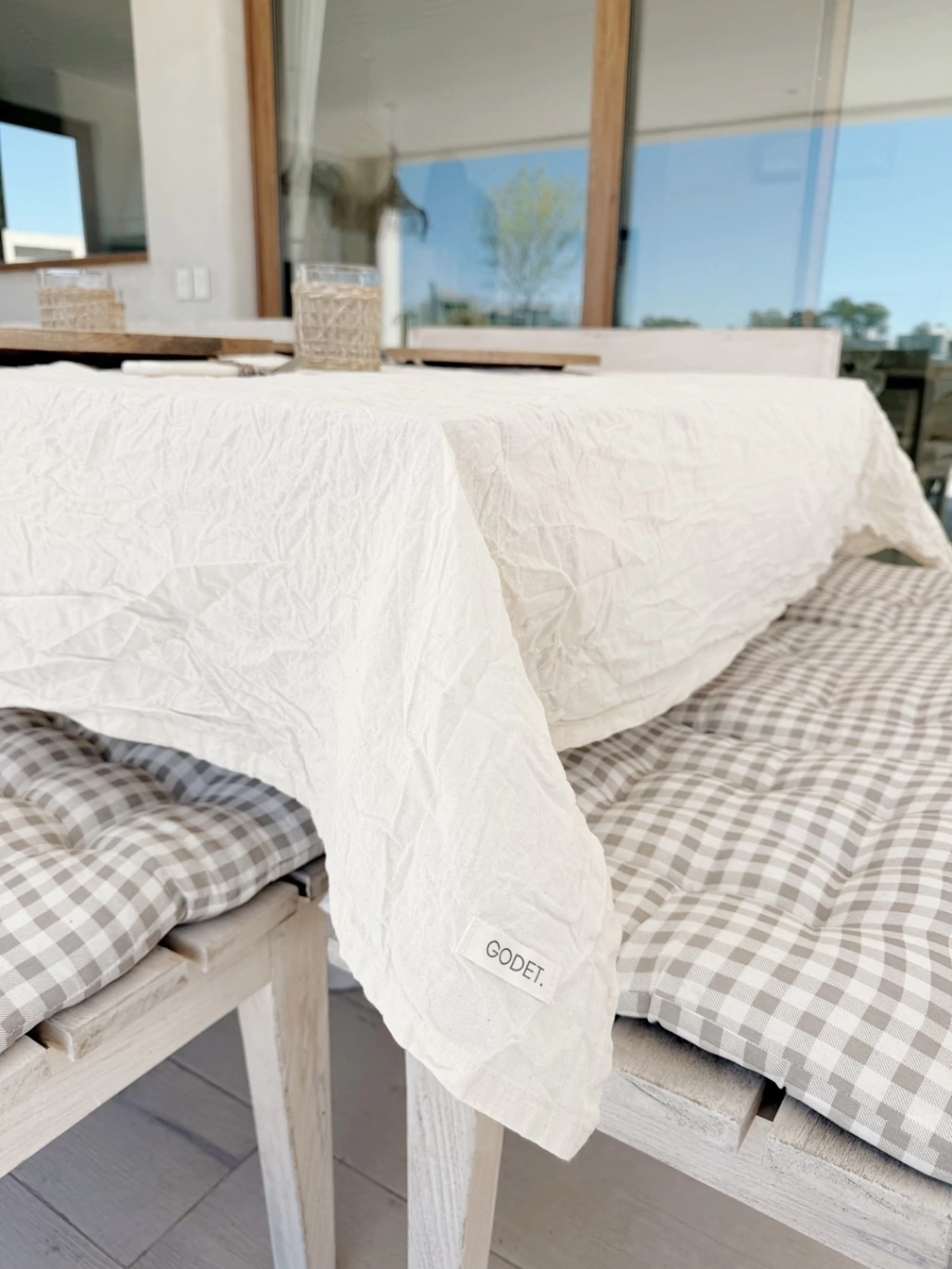 Nuestro mantel está confeccionado en algodón 100%, con esa arruga única y canchera que no vas a encontrar en ningún otro lado. Disponible en dos medidas —2,20 m y 3,10 m de largo—, se adapta a diferentes mesas y ocasiones.