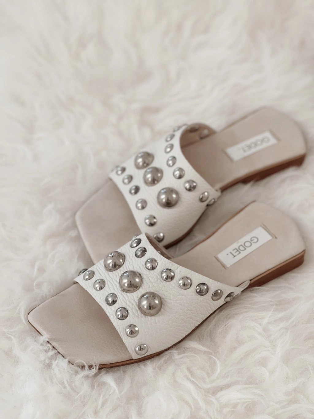 Sandalia adaptada a la vida cotidiana, confeccionada en cuero vacuno con terminación al corte y sin costuras. Se destaca en la colección por el detalle de las tachas bombe de baño níquel, haciendo lucir tu outfit de lo más canchero.